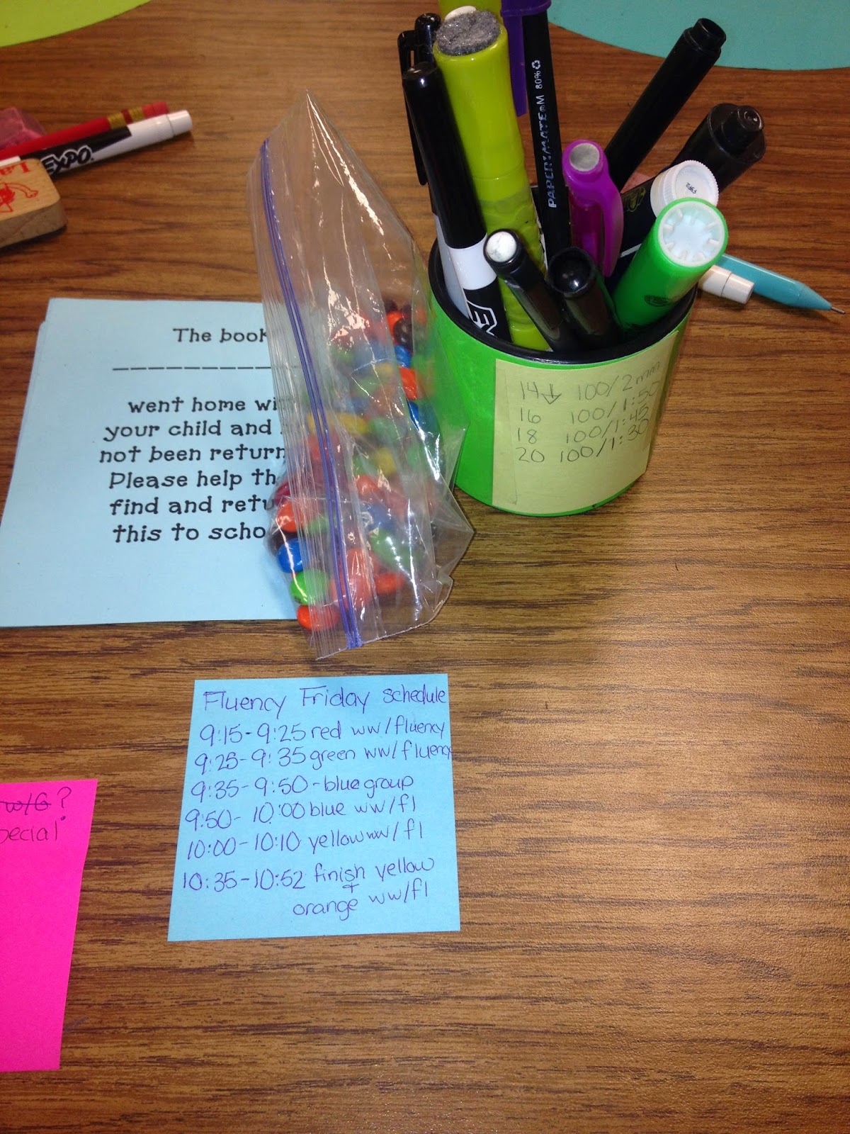 I keep a pop up dispenser of sticky notes because on Monday I put a sticky note on the inside cover of each students book. This makes it really easy for me to see if it has been read. I highlight the parent signature each day and the student gets one M&M if it was read. I write a M, T, W, T on it to show the night it wasn't read. I put a star on their chart if it was read all four days. We switch the sticky note over when we switch books on Wednesday. I also have a little note to send home if the book didn't make it's way back to school. Also, I keep a list of missing books on the sticky note. In my cup I have extra supplies and my writing utensils. On the outside of the cup, I have a list of words per minute expectations at different levels so I can quickly reference it. I use the flag sticky notes for a couple different things. Sometimes we have long books that I let them start from where they got to during the guided reading time at home so it doesn't take as long. Also, during chapter books we may split the book between the beginning and end of the week so this can show the stopping point.
